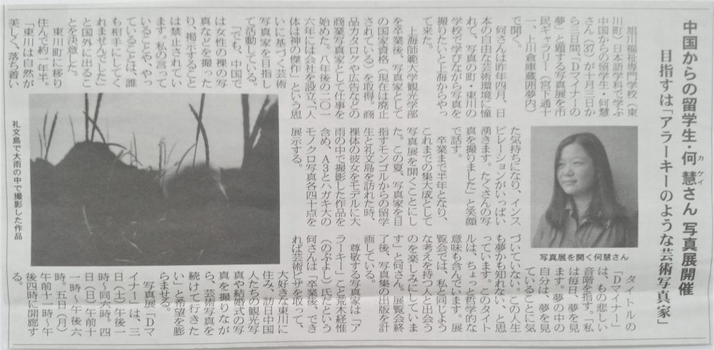 日本語学科で学ぶ中国上海からの留学生、何慧(カ・ケイ)さんが10月に旭川市内のギャラリーで写真個展を開催することになり、あさひかわ新聞報道部長、佐久間和久さんの取材を受けて、9月29日号の紙面で大きく紹介されました。