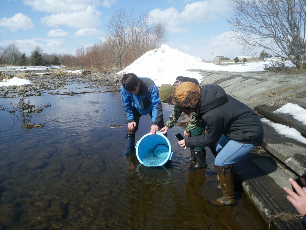昨年12月から本校で飼育してきたサケの稚魚を3月22日(日曜)午前、忠別川に放流しました。