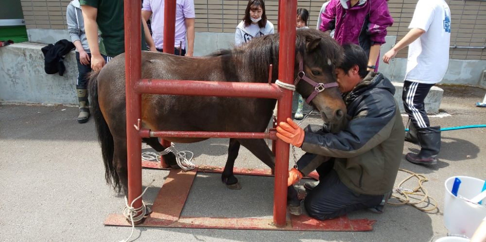 温かい日が続くようになったので、介護福祉科2年生がポニーにシャワーをしました。