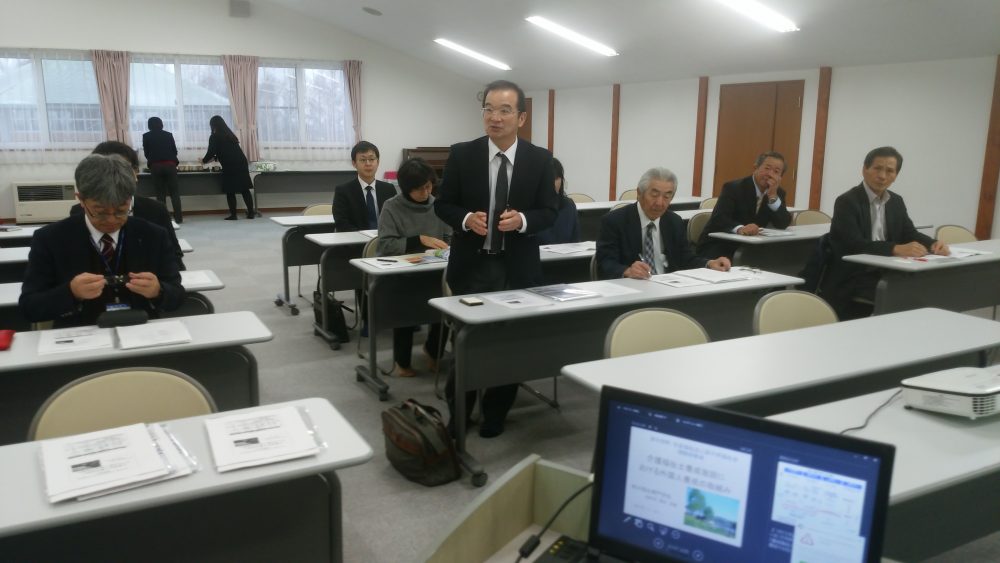 続いて黒田英敏副校長が昨年12月に組織された「外国人介護福祉人材育成支援協議会」について詳しく解説しました。東川、鷹栖、幌加内、浜頓別の4町と本校、各社会福祉施設で結成され、参加自治体、施設は留学生を奨学金で応援し、卒業後は支援した町、施設で介護福祉士として現場の中心的役割を果たしてもらう仕組みです。協議会へ参加する町、施設は増えてきて、マスコミでも紹介されるようになりました。