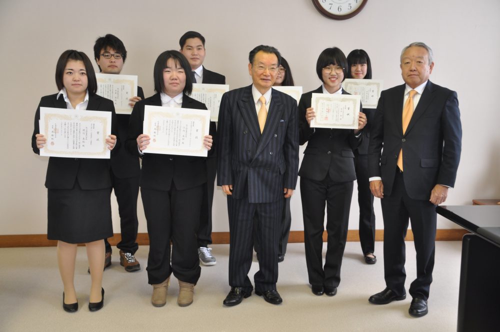 全国間税会総連連合会が毎年、募集している「税の標語」に本校からも大勢の学生が応募し、優秀賞となる北海道間税会連合会会長賞に5名の学生の作品が選ばれるなど、本校では8名もの学生の作品が入賞しました。「税を考える週間」に合わせて11月29日、第2校舎の理事長室で授賞式が行われ、旭川中間税会の生駒雅彦副会長(株式会社生駒組社長)から表彰状が授与されました。